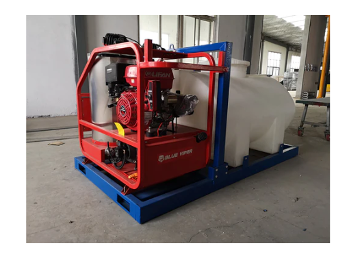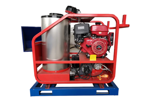 This Hot Water Pressure Washer with Water Tank features 4000 PSI, and it is a commercial pressure washer and used to prep for paint and on tough stains and recommended for professional cleaners, municipalities, construction sites, farms, and hotels. It is a gasoline driven and diesel heated hot water pressure washer. You’ll want to make sure you choose a hot water pressure washer or industrial power washer if the surface you are cleaning contains any type of grease, grime or oil. Just like doing your dishes, cold water only moves oil around but doesn't clean it away. These hot water pressure washers are heated with diesel and they are designed to blast away tough grease and grime.